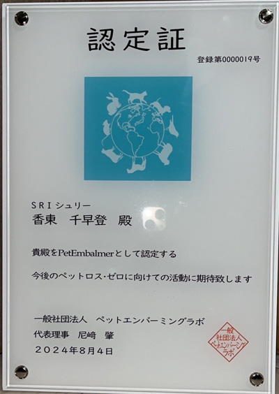 同時に日本では数少ないペットの「エンバーミング」を行う資格を取得し、ペットの遺体保全もおこなっている。